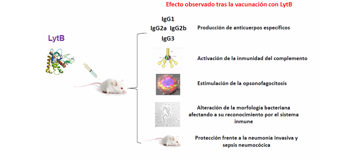 La inmunización con LytB causa el disparo de la vía clásica del complemento pudiéndose demostrar, además, que los anticuerpos anti-LytB alteran la morfología bacteriana y estimulan la fagocitosis de S. pneumoniae. La vacunación con LytB incrementa la eliminación de la bacteria e induce protección. El hecho de que LytB esté muy conservada entre las diferentes cepas de neumococo y de que esta proteína esté implicada en importantes procesos como la colonización e invasión de la nasofaringe, la formación de biofilms y la evasión de la respuesta inmune del hospedador, puede convertir a LytB en un buen candidato para una próxima vacuna proteica contra este importante patógeno humano.