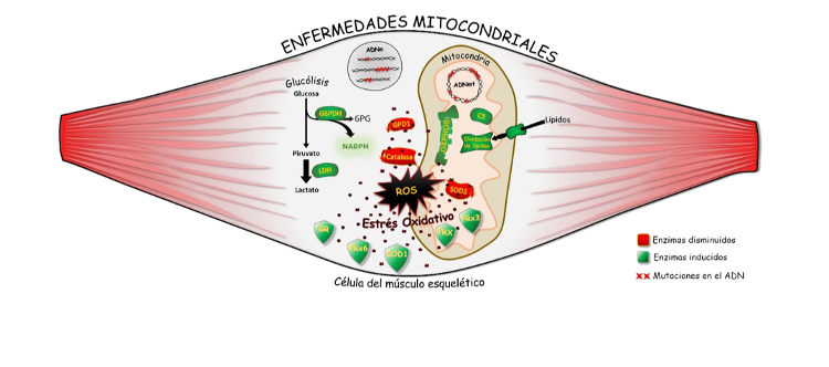 Los resultados han revelado que el músculo esquelético de los pacientes afectados por las tres EMs presenta alteraciones muy similares en la cantidad de algunas proteínas del metabolismo energético y de las enzimas de la respuesta antioxidante, independientemente de los defectos genéticos que causan estas patologías. En concreto, los investigadores han encontrado una fuerte inducción de enzimas del sistema antioxidante como glutatión reductasa (GR), tiorredoxina (TRX), peroxirredoxinas (PRx3 y PRx6) y superóxido dismutasa 1 citoplasmática (SOD1) en una situación paradójica donde las principales enzimas de detoxificación de los radicales libres producidos en la mitocondria y en el citoplasma, como son superoxido dismutasa 2 mitocondrial (SOD2) y catalasa, están fuertemente inhibidas. En esta situación, las proteínas musculares de los pacientes con las tres EMs estudiadas presentan un daño oxidativo mayor que el encontrado en individuos sanos.