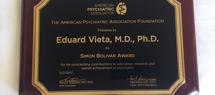 El Dr. Eduard Vieta, jefe de servicio de Psiquiatría y Psicología del Hospital Clínic de Barcelona y del grupo Trastornos Bipolares del IDIBAPS, profesor titular de la Universidad de Barcelona, y director científico del CIBERSAM, ha sido galardonado con el premio Simón Bolívar por la Asociación Americana de Psiquiatría (APA).
