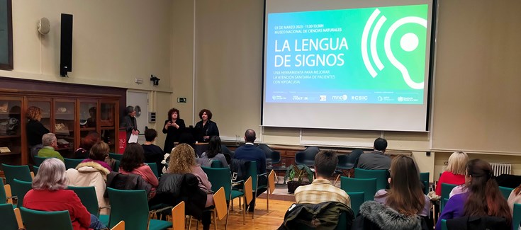 La actividad, organizada por el CIBERER en colaboración con el Museo Nacional de Ciencias Naturales del CSIC y titulada "La lengua de signos: una herramienta para mejorar la atención sanitaria en pacientes con hipoacusia" incluyó una interesante mesa redonda moderada por la Prof. Varela-Nieto, y en la que participaron Luis Lassaletta (Servicio ORL del Hospital Paz y CIBERER), Miguel Ángel Moreno-Pelayo (Servicio Genética Hospital Ramón y Cajal y CIBERER), Mª Luz Esteban (Directora Centro de Normalización Lingüistica de la Lengua de Signos Española) y David Sánchez (Fundación CNSE para la Supresión de las Barreras de Comunicación). El evento celebrado el 3 de marzo fue gratuito, accesible para personas con discapacidad auditiva y pudo seguirse además en streaming a través del canal youtube del Museo.