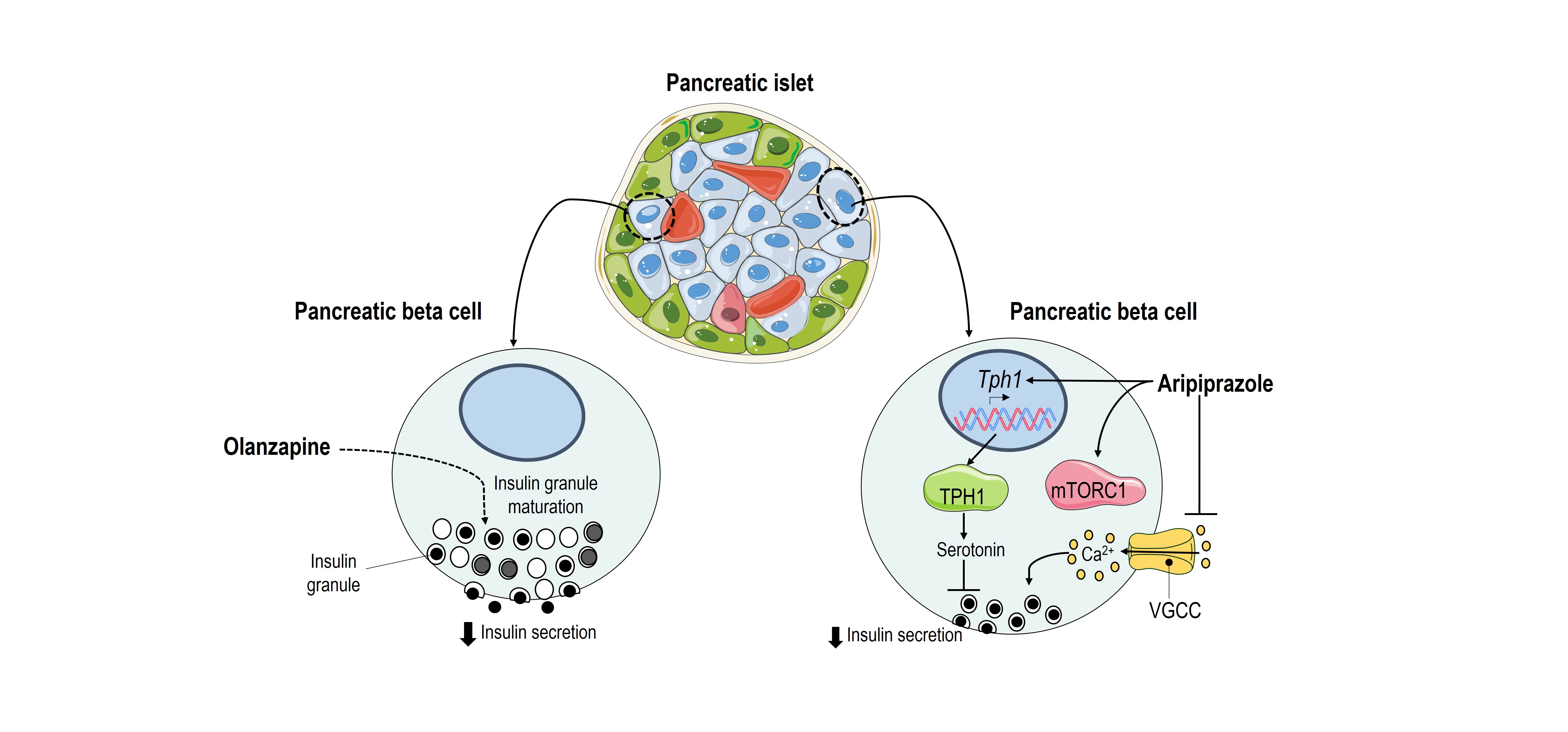 Los estudios ex vivo en islotes tratados con aripiprazol demostraron que la inhibición de la secreción de insulina era debida a una reducción de la entrada de calcio y que los defectos en la secreción de insulina por el aripiprazol se prevenían con el co-tratamiento con un inhibidor de la TPH1.