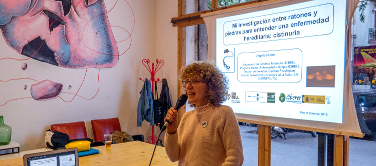 La Dra. Nunes, también profesora de Genética de la Universidad de Barcelona y coordinadora del Programa Genes, Enfermedad y Terapia del IDIBELL, participó el 15 de mayo en uno de los actos realizados en Barcelona, en el Bar Bacanal, con la charla titulada “Mi investigación entre ratones y piedras para entender una enfermedad hereditaria: cistinuria”.