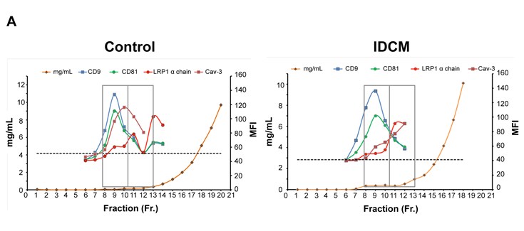 Como resultado, los investigadores han demostrado que se detecta un incremento de los niveles circulantes de sLRP1 en los pacientes con MCDI en comparación con controles sanos. Por otro lado el estudio ha servido para aislar VE de ambos grupos mediante cromatografía de exclusión molecular y analizar la presencia de este posible nuevo biomarcador. En este último caso el resultado ha sido negativo ya que al parecer sLRP1 se secretaría de forma independiente de la vía exosomal, hecho que de momento no favorece que se conozca su origen exacto aunque los mismos autores describieron su acumulación en dominios ricos en colesterol dentro del miocardio de este tipo de pacientes en un trabajo anterior.