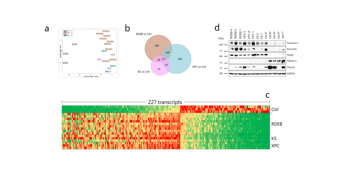 (*) Explicación de la imagen: (a) Firma de expresión genética en fibroblastos de pacientes EBDR, SK y XPC, en comparación con donantes sanos. (b; c) Se identificó una alteración común a las tres enfermedades de 227 genes, (d) con especial representación de aquellos asociados a cambios en la matriz extracelular.
