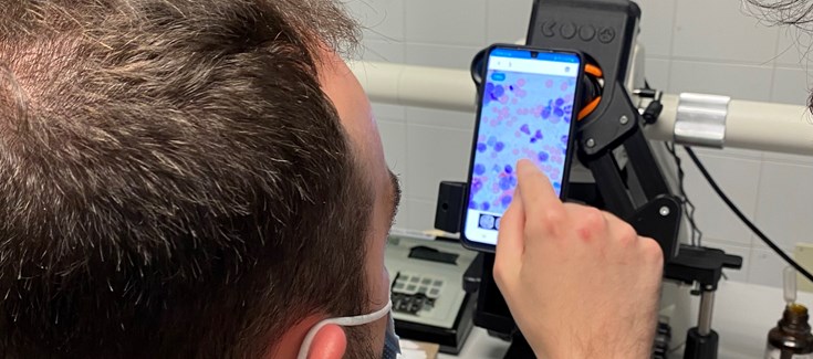 El recuento diferencial de células de los aspirados de médula ósea es una técnica que a día de hoy se realiza manualmente en la mayoría de los centros sanitarios. Esta es una tarea que requiere mucho tiempo y cuyo resultado puede variar dependiendo de la experiencia del observador. Por este motivo, este procedimiento resulta ser un candidato adecuado para ser automatizado gracias a la inteligencia artificial, objetivo de este proyecto multidisciplinar con el liderazgo clínico de Joaquin Martinez del Hospital 12 de Octubre y CIBERONC y en colaboración con el el Hospital Universitario Fundación Alcorcón y el Hospital Vall d’Hebron. “Hemos diseñado específicamente un algoritmo de inteligencia artificial basado en deep learning que es capaz de diferenciar y contar de forma automática diferentes tipos celulares en imágenes de muestras de médula ósea” detalla David Bermejo-Peláez investigador del CIBER-BBN y Spotlab. Para la digitalización de imágenes, el sistema no necesita escáneres ni dispositivos complejos y de alto coste, sino que lo hace utilizando teléfonos móviles inteligentes –smartphones–, lo que lo convierte en un sistema escalable y que puede implementarse en cualquier servicio de hematología de cualquier hospital del mundo.