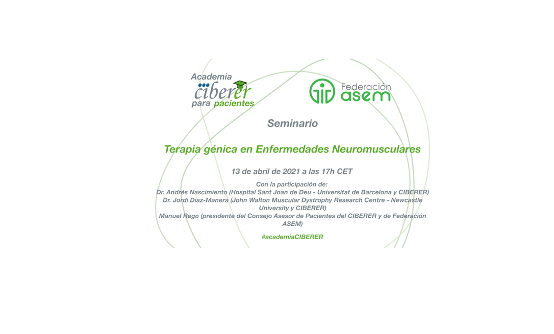 La “Academia CIBERER para Pacientes” organiza un Seminario sobre Terapia Génica en Enfermedades Neuromusculares el próximo martes 13 de abril a las 17h CET (hora de Madrid).