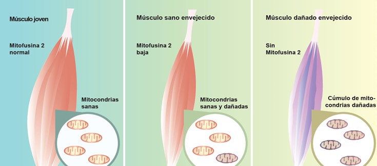 Los científicos liderados por Antonio Zorzano, jefe de grupo del CIBERDEM en el IRB Barcelona, catedrático de la UB e ICREA Academia, observan que los ratones durante el envejecimiento y de forma natural, van perdiendo específicamente expresión de Mitofusina 2 en los músculos. Demuestran que la baja actividad de esta proteína en ratones de 24 meses (equivalentes a una persona de 80 años) está directamente relacionada con la atrofia muscular y la sarcopenia que presentan. Los científicos confirman la asociación entre pérdida de Mitofusina 2 y envejecimiento muscular cuando eliminan la proteína en el músculo de ratones de 6 meses (equivalentes a una persona de 30 años) porque aceleran el envejecimiento, reproduciendo prematuramente las condiciones de la musculatura de ratones viejos.