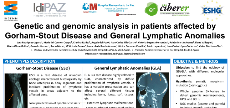 Su grupo de investigación, coordinado por el investigador CIBERER Víctor Martínez-Glez, también de la U753, presentó el trabajo titulado “Genetic and genomic analysis in patients affected by Gorham-Stout Disease and General Lymphatic Anomalies”, en el que mostró el uso de la tecnología de secuenciación masiva (NGS) y el diseño de algoritmos bioinformáticos específicos para la detección de variantes en mosaicos bajos en la enfermedad de Gorham-Stout y en las anomalías linfáticas generalizadas.