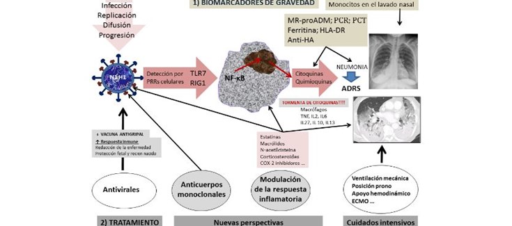 Secuencia de activación inflamatoria debida al virus de la influenza A (IAV) y su evolución en neumonía y síndrome de distrés respiratorio agudo (SDRA). En la parte superior (1) posibilidades de Biomarcadores de gravedad en la infección por IAV. en la parte inferior (2) efecto de la vacunación, tratamiento convencional con antivirales y soporte respiratorio y hemodinámico en UCI. Posibilidades de nuevas perspectivas de tratamiento que modulen la respuesta inflamatoria, generalmente o específicamente, y la administración de anticuerpos monoclonales (figura modificada de la referencia 1 con permiso de los autores)