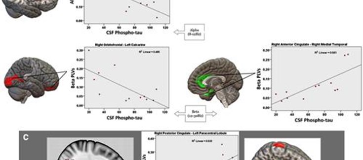 Pares de regiones que muestran de forma significativa anormalidades en la conectividad funcional en base a los niveles de p-tau en el LCR. Regiones corticales que exhiben una desincronización relacionada con los niveles de p- tau [a] y regiones corticales que muestran una hipersincronización relacionada con los niveles de p-tau [b]. Los diagramas de dispersión muestran las correlaciones entre estas conexiones funcionales y los niveles de p-tau. [c] Correlación significativa entre las conexiones funcionales y las estructurales. Imágenes del tensor de difusión (DTI) del cíngulo del hipocampo derecho y de las regiones desincronizadas, muestran una correlación significativa con la anisotropía fraccional. En el diagrama de dispersión se proporcionan los valores de la correlación entre la anisotropía fraccional y la conectividad funcional.