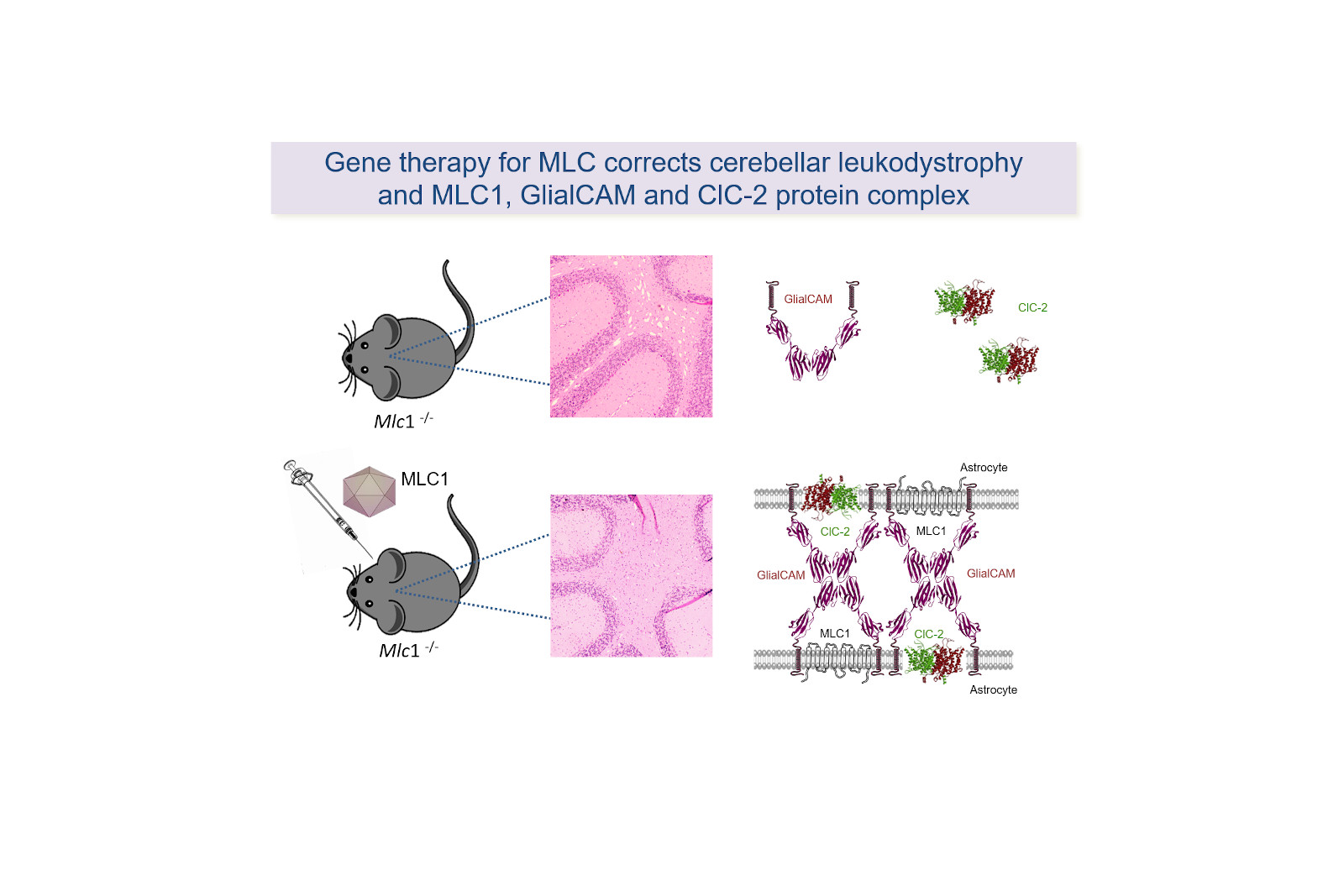 Esquema que representa la corrección conseguida en el modelo murino de la enfermedad MLC. Este modelo (Mlc1-/-) presenta vacuolización en el cerebelo y las proteínas GlialCAM y ClC-2 se encuentran deslocalizadas. Después de admininistar virus adenoasociados que expresan Mlc1 en astrocitos se reduce la vacuolización y se recupera la localización de estas proteínas.