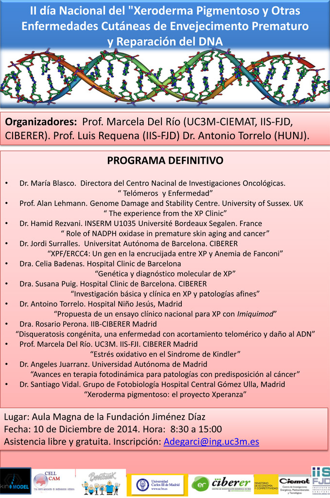 La doctora Marcela del Río (U714 CIBERER) coorganiza el II Día nacional del xeroderma pigmentoso y otras enfermedades cutáneas de envejecimiento prematuro y reparación del DNA, que se celebra en la Fundación Jiménez Díaz de Madrid el 10 de diciembre. En este encuentro, en el que participan también los doctores Jordi Surrallés (U745), Susana Puig (U726) y Rosario Perona (U757), se presentarán los avances en diferentes líneas de investigación con charlas sobre la relación entre telomeros y enfermedad, genética y diagnóstico molecular, investigación básica y clínica, propuesta de un ensayo clínico nacional con Imiquimod, acortamiento telomérico o el papel del gen ERCC4 en xeroderma pigmentoso.
