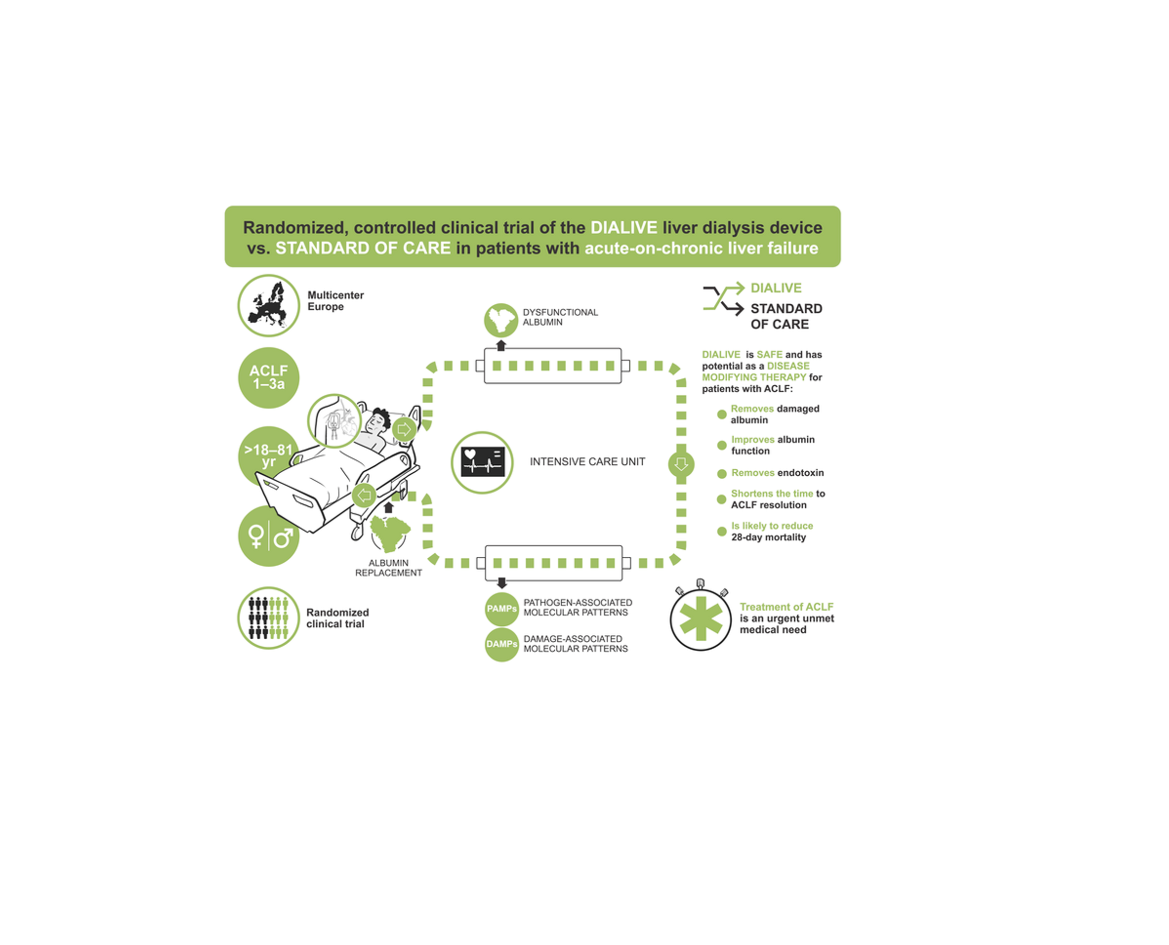El ensayo internacional, controlado y aleatorizado desarrollado en 18 hospitales europeos se ha realizado en pacientes con cirrosis y hepatitis alcohólica que sufrían insuficiencia hepática aguda sobre crónica. Los pacientes fueron aleatorizados a recibir de tres a cinco sesiones de tratamiento, con una duración de ocho a doce horas por sesión con el dispositivo DIALIVE o a recibir el tratamiento estándar