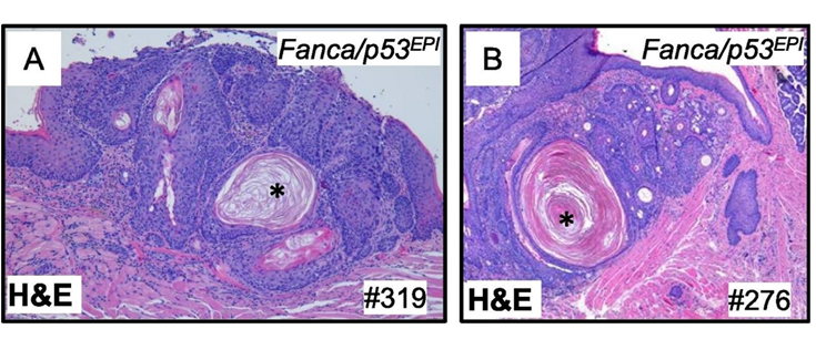 Como las mutaciones de TP53 son las aberraciones somáticas más frecuentes en AF-CECyC, cruzamos animales Fanca-/- con ratones K14cre;Trp53F2-10/F2-10 que carecen de p53 en epitelios estratificados (como la mucosa oral).