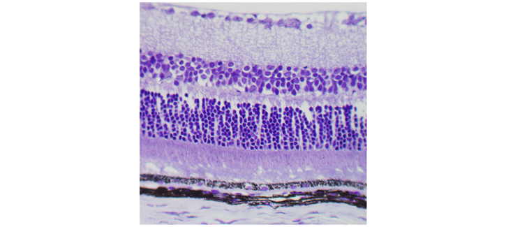 (*) Explicación de la imagen: Imagen histológica de retina de ratón pigmentado en la que se distinguen todas las capas, desde el coroides (abajo, lleno de melanocitos) al inmediato epitelio pigmentado de la retina y acabando (arriba de todo) con las células ganglionares. Fotografía: Santiago Josa.