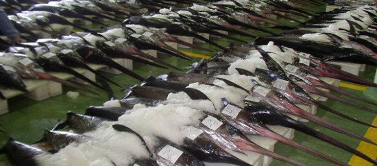 Subasta en la lonja de Vigo de pez espada, una de las especies en las que se acumula más mercurio. / José Antonio Gil Martínez (SINC)